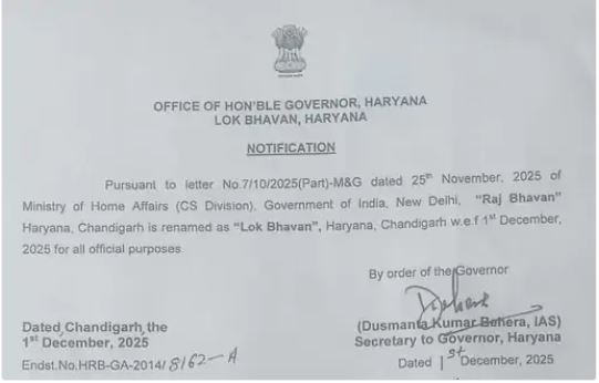 हरियाणा: भारत के राज्य हरियाणा से एक बड़ी खबर सामने आ रही है। मिली जानकारी के अनुसार हरियाणा में राज भवन का नाम बदलकर अब लोक भवन रख दिया गया है। इस नए नाम के रखे जाने के बाद अब लोग राज भवन को लोक भवन के नाम से जानेंगे। इस बात की जानकारी राज्यपाल असीम घोष ने नोटिफिकेशन जारी कर दी है। यह अधिसूचना 1 दिसंबर से लागू हो गई है।