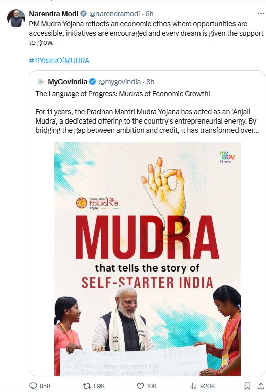“आज से ठीक 11 वर्ष पहले शुरू की गई प्रधानमंत्री मुद्रा योजना युवाओं के स्वरोजगार में बहुत मददगार साबित हुई है। इस योजना की सफलता बताती है कि सही अवसर मिलने पर व्यक्ति न सिर्फ आत्मनिर्भर बन सकता है, बल्कि राष्ट्र की प्रगति में भी योगदान दे सकता है।