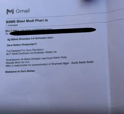 वहीं धमकी भरी मेल में साफ़ लिखा है कि आज 3-4 स्कूलों में बम धमाका होगा। हम गुरु रविदास जी की फुल रिस्पेक्ट करते हैं। लेकिन मोदी खालिस्तान वालों का दुश्मन है। खालिस्तानियों का बाबा निरंजन दास के साथ कोई गिला-शिकवा नहीं है। मसला मोदी का है। निज्जर की मौत का जिम्मेदार कौन है…बदला…बदला…बदला। निशाने पर डेरा बल्लां। मोदी खालिस्तान का दुश्मन है।