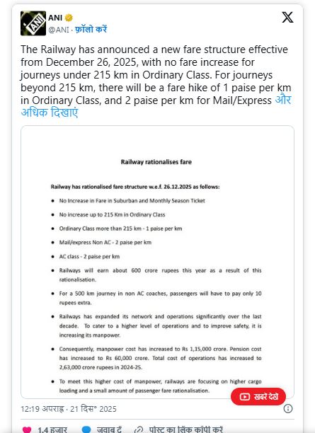 नई दिल्ली: इंडियन रेलवे ने रेल द्वारा लंबी यात्रा करने वाले यात्रियों को बड़ा झटका दिया है। रेलवे ने लंबी दूरी की यात्रा के लिए किराए में बढ़ोतरी की घोषणा की है। जानकारी के अनुसार रेल द्वारा 215 किलोमीटर से ज्यादा का सफर करने वाले यात्रियों को अब हर किलोमीटर के लिए 1 से 2 पैसे अतिरिक्त चुकाने होंगे। यह नया किराया 26 दिसंबर 2025 से लागू होगा। हालांकि 215 किलोमीटर से कम दूरी की यात्रा करने वालों और मंथली सीजन टिकट होल्डर्स के लिए किराए में कोई बदलाव नहीं किया गया है। रेलवे द्वारा की इस बढ़ोतरी के बाद अब जनरल, मेल/एक्सप्रेस और एसी (AC) श्रेणियों के टिकट महंगे हो जाएंगे।