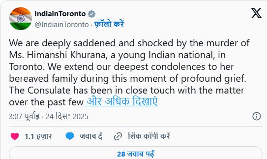 टोरंटो में भारतीय महावाणिज्य दूतावास ने इस हत्या मामले की पुष्टि की और घटना पर गहरा दुख जताया। सोशल मीडिया प्लेटफॉर्म X पर एक पोस्ट में वाणिज्य दूतावास ने कहा, “टोरंटो में एक युवा भारतीय नागरिक हिमांशी खुराना की हत्या से हम बहुत दुखी और स्तब्ध हैं। गहरे दुख की इस घड़ी में हम उनके शोक में डूबे परिवार के प्रति अपनी गहरी संवेदना व्यक्त करते हैं।”