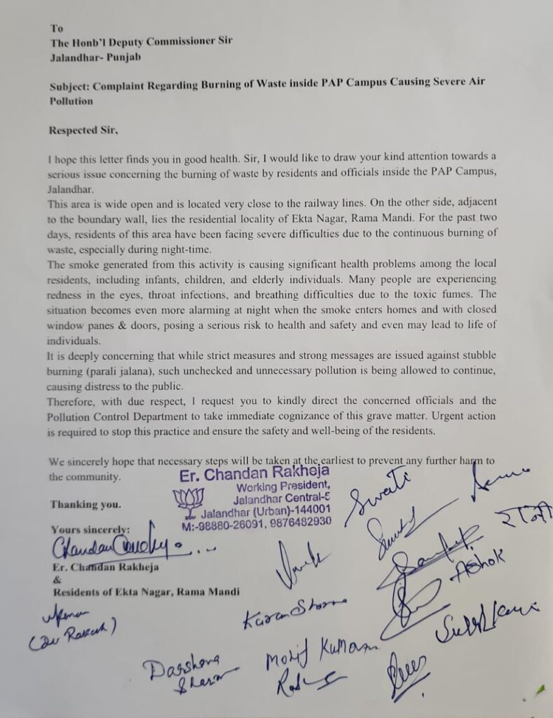 जालंधर : PAP कैंपस में लगातार कूड़ा जलाए जाने से फैल रहे गंभीर प्रदूषण और जन-स्वास्थ्य पर पड़ रहे दुष्प्रभावों को लेकर भाजपा नेता इंजी. चंदन रखेजा ने इलाका निवासियों के साथ डिप्टी कमिश्नर जालंधर वरजीत वालिया को लिखित शिकायत सौंपकर तत्काल कार्रवाई की मांग की।