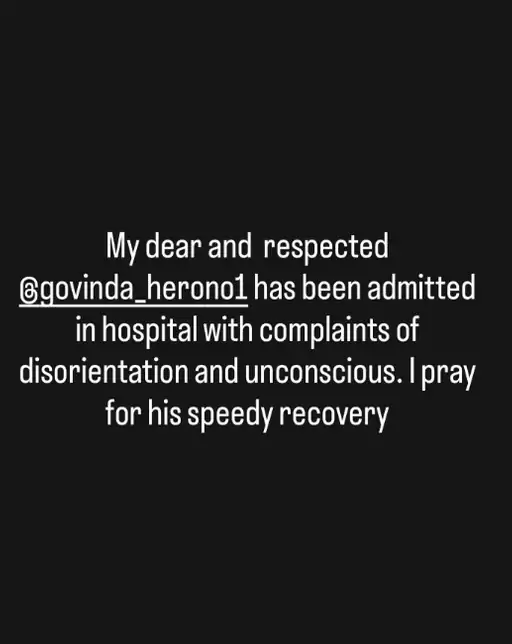 वहीं न्यूज एजेंसी को ललित बिंदल ने कहा कि गोविंदा को आधी रात को घर पर चक्कर आया और वे बेहोश हो गए। इसके बाद उन्हें जुहू स्थित क्रिटिकेयर अस्पताल ले जाया गया। गोविंदा की तबीयत को लेकर डॉक्टर फिलहाल जांच कर रहे हैं। बिंदल ने यह भी बताया कि गोविंदा ने मुझे फोन किया, तो मैं उन्हें तुरंत अस्पताल ले गया। जहां उन्हें दवा देने के बाद इमरजेंसी वार्ड में भर्ती कराया गया। उन्होंने बताया कि सभी जांचें हो चुकी हैं। अब हम रिपोर्ट और न्यूरोलॉजिस्ट की सलाह का इंतजार कर रहे हैं। उनकी हालत अब स्थिर है।