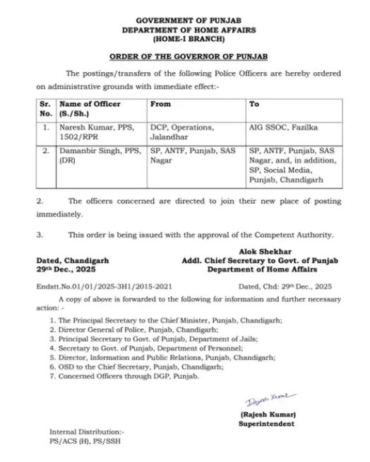 जालंधर: पंजाब के जालंधर के पुलिस विभाग में बड़ा फेरबदल किया गया है। पुलिस विभाग में तबादलों के तहत जालंधर के डीसीपी नरेश डोगरा का तबादला कर दिया गया है। इस संबंध में आदेश भी जारी कर दिए गए हैं। जारी आदेशों के अनुसार डीसीपी डोगरा को तबादले के बाद AIG स्टेट स्पेशल ऑपरेशन सेल (SSOC) फाजिल्का नियुक्त किया गया है। यह तबादला पंजाब सरकार की ओर से जारी आदेशों के तहत किया गया है।