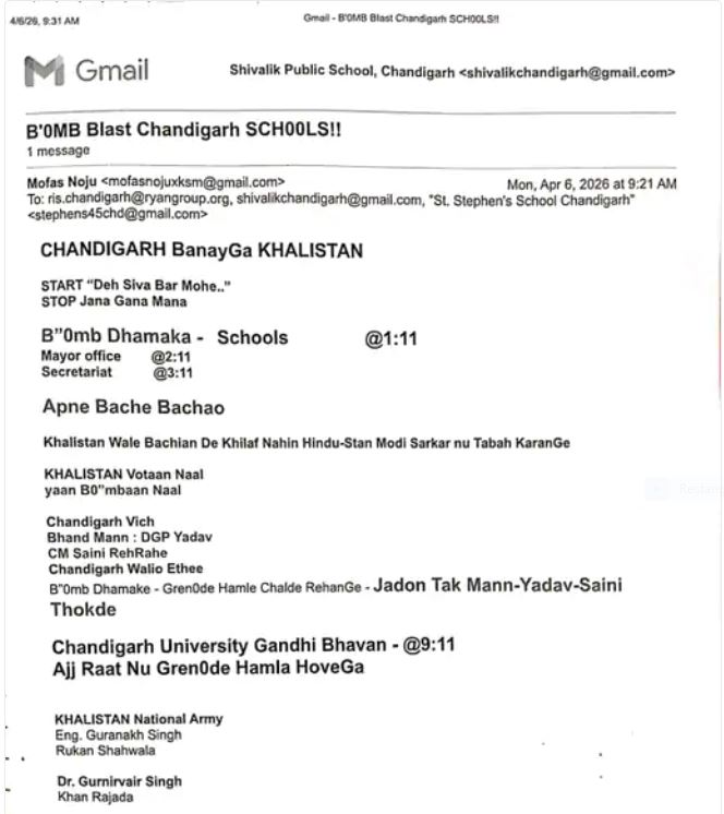 चंडीगढ़ में मिली ईमेल में लिखा है कि चंडीगढ़ खालिस्तान बनेगा। देह सिवा बर मोहे स्टार्ट करो और जन-गण-मन बंद करो। स्कूलों में 1:11 बजे बम धमाका होगा। मेयर ऑफिस में 2:11 बजे धमाका और सेक्रेटेरिएट में दोपहर 3:11 बजे धमाका होगा। अपने बच्चे बचाओ। आगे लिखा है- खालिस्तान वाले बच्चों के खिलाफ नहीं, हिंदुस्तान मोदी सरकार को तबाह करेंगे। खालिस्तान वोटों से या बम से। चंडीगढ में भगवंत मान, डीजीपी यादव और सीएम सैनी की रिहायश को निशाना बनाएंगे। चंडीगढ़ वालो, यहां बम धमाके – ग्रेनेड हमले चलते रहेंगे, जब तक मान, यादव, सैनी नहीं मरते। इसके साथ ही ईमेल भेजने वाले ने चंडीगढ़ यूनिवर्सिटी गांधी भवन में आज रात 9:11 बजे ग्रेनेड हमला होने की भी बात कही है।