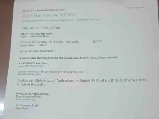 इसके साथ ही मेल भेजने वालों ने खुद को “खालिस्तान नेशनल आर्मी” से जुड़ा बताया है और वहीं पंजाब के मुख्यमंत्री भगवंत मान व आम आदमी पार्टी के नेता अरविंद केजरीवाल को भी निशाना बनाने की बात कही गई है।