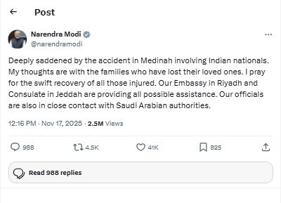प्रधानमंत्री ने सोशल मीडिया प्लेटफार्म X पोस्ट करते हुए कहा कि रियाद स्थित भारतीय दूतावास और जेद्दा स्थित वाणिज्य दूतावास प्रभावित लोगों को हर संभव सहायता प्रदान कर रहे हैं। उन्होंने यह भी बताया कि आवश्यक सहायता और समन्वय सुनिश्चित करने के लिए भारतीय अधिकारी सऊदी अरब के अधिकारियों के साथ निरंतर संपर्क में हैं।
