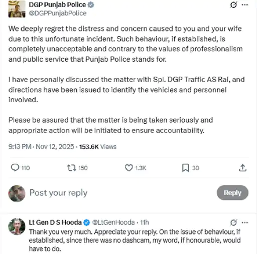 डीजीपी गौरव यादव ने पोस्ट पर प्रतिक्रिया देते हुए कहा कि उन्हें अफ़सोस है कि पूर्व LG हुड्डा के साथ साथ ऐसी घटना हुई। वहीं उन्होंने यह भी कहा कि अगर ऐसा व्यवहार वाकई सामने आता है, तो उसे बर्दाश्त नहीं किया जाएगा।