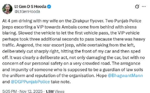चंडीगढ़: जीरकपुर फ्लाईओवर पर बीते दिन शाम 4 बजे के करीब सर्जिकल स्ट्राइक के हीरो रिटायर्ड लेफ्टिनेंट जनरल डी.एस. हुड्डा की कार को वीआईपी काफिले में शामिल पंजाब पुलिस की एक गाड़ी ने टक्कर मार दी। घटना के समय हुड्डा अपनी पत्नी के साथ अंबाला रोड जा रहे थे। इस घटना की जानकारी हुड्डा ने सोशल मीडिया प्लेटफार्म ‘एक्स’ पर एक पोस्ट डालकर दी।