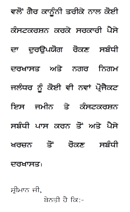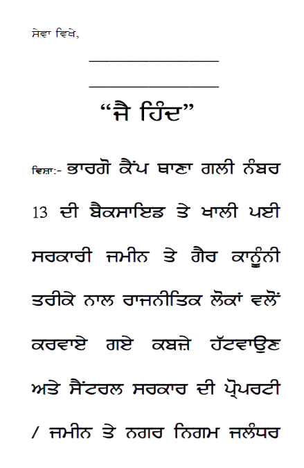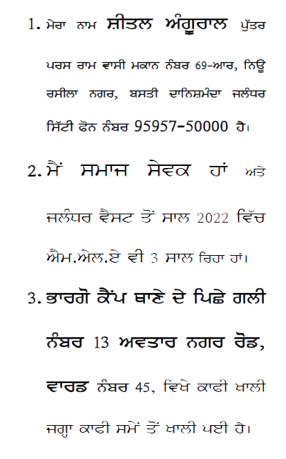 इस अवसर पर पूर्व विधायक शीतल अंगूराल ने दोनों अधिकारियों को लिखित शिकायत समेत पंजाब सरकार के चीफ सेक्टरी, डीसी जालंधर, सेक्रेटरी निकाय विभाग द्वारा निगम कमिश्नर जालंधर को इस विवादित केंद्र सरकार की जमीन पर किसी भी तरह का कोई निर्माण ना करने के लिखित ऑर्डर की कापी समेत नक्शा दिया। वही शीतल अंगूराल ने केंद्र सरकार की सेंट्रल गवर्नमेंट की मलकियत वाली फर्द इंतकाल की कॉपियां भी अधिकारियों को फोटो समेत शिकायत के साथ दर्ज करवाई है। शीतल ने डीसी को बताया कि जो लोग 1992 की रजिस्ट्री का दावा कर रहे है उनकी निशानदेही रजिस्ट्री पर साइड, खसरा नंबर कहां के है और इस केंद्र सरकार की जमीन पर उनकी मलकियत किस अलॉटमेंट लेटर अथवा किस दस्तावेज के अधार पर खड़ी है उसकी भी जांच हो अगर कुछ भी गलत पाया जाता है ,तो तुरंत इंतकाल रजिस्ट्री कैंसिल कर दोषी अधिकारियों समेत अवैध कब्जाधारियों और उनको संरक्षण देकर सरकारी जमीन कब्जाने की कोशिश करने वालों पर कानूनी कारवाई की जाए।
