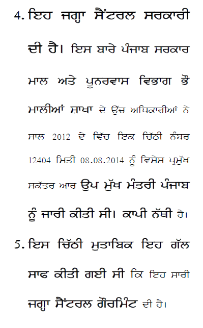 शीतल ने कहा फर्द केंद्र सरकार के नाम पंजाब सरकार के सेक्रेटरी और डी. सी द्वारा रोक के लिखित ऑर्डर मौजूद है। अब नगर निगम जालंधर के अधिकारियों की नाक नीचे अवैध निर्माण कैसे हुआ। इस पर भी जांच करवा डी. सी जालंधर एवं मेयर को सख्त कानूनी कारवाई करनी चाहिए। वही इस मामले पर जालंधर भाजपा के महामंत्री अशोक सरीन हिक्की ने डीसी जालंधर से अपील कर बोला डीसी जालंधर इस केंद्र सरकार की मलकियत वाली जमीन को लेकर एडीसी के नेतृत्व मे रेवेन्यू डिपार्टमेंट, नगर निगम और पुलिस विभाग की ज्वाइंट एक्शन कमेटी गठित कर मलकियत, कब्जे, रजिस्ट्री, निशानदेही जैसे हर पहलू की जांच करवाए। उसके बाद कोई भी निर्माण इस विवादित जमीन पर हो।