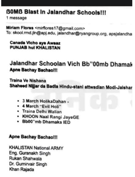 बताया जा रहा है कि ईमेल के जरिए जालंधर के APJ स्कूल और पुलिस DAV स्कूल को बम से उड़ाने की धमकी मिली है। ईमेल में धमकी भेजने वाले ने लिखा है कि 4 मार्च को खून की होली होगी और अपने बच्चों को बचा लो !
