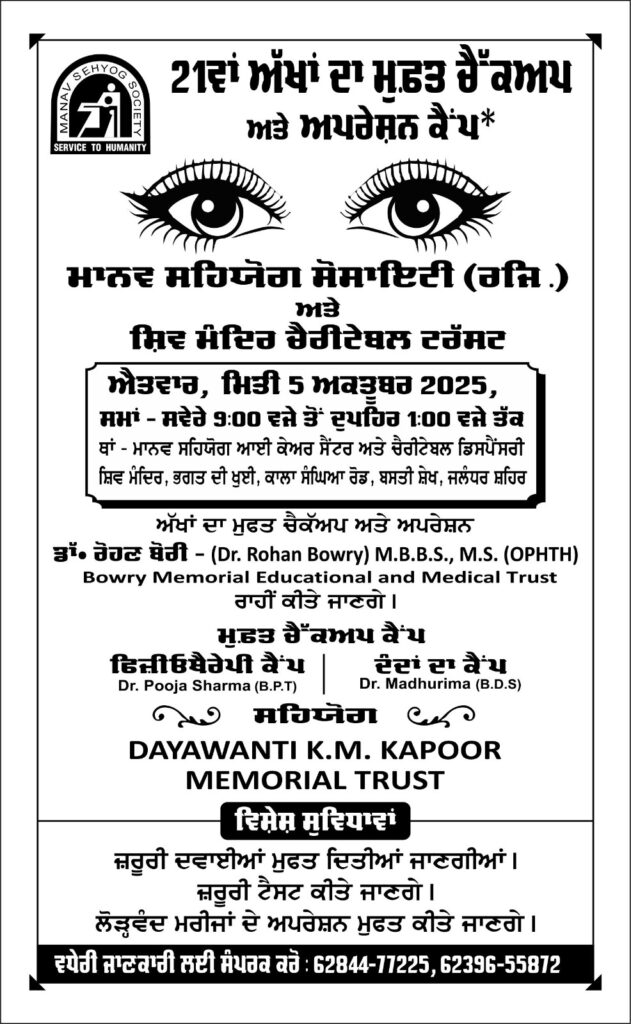 जालंधर: मानव सहयोग सोसाइटी की तरफ से 5 अक्टूबर दिन रविवार को मुफ्त जांच कैंप लगाया जा रहा है। जिसमें मुख्य रूप से (बोरी मेमोरियल एजुकेशनल एंड मेडिकल ट्रस्ट) के डॉ रोहन बोरी कैंप में आने वाले लोगों की आंखों की मुफ्त में जांच करेंगें। कैंप के दौरान फिजिओथेरपी और दांतों के चेकअप की भी मुफ्त में सुविधा दी जाएगी।