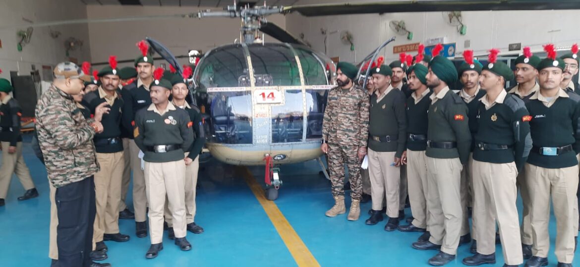 जालंधर: जालन्धर एनसीसी ग्रुप के 210 सीनियर डिवीजन कैडेट सिख लाइट इन्फैंन्ट्री बटालियन के साथ बारह दिवसीय सैन्य कैम्प जालन्धर कैन्ट में कर रहे है। कैडेटों ने एविएशन स्क्वाड्रन में हेलिकाप्टर चेतक, चीता और ध्रुव के बारे मे विस्तृत जानकारी प्राप्त की। हेलिकाप्टर के पायलटों ने कैडेटों को हेलिकाप्टर की कार्यप्रणाली, उड़ान और स्पीड पर विस्तृत जानकारी कैडेटों को दी।