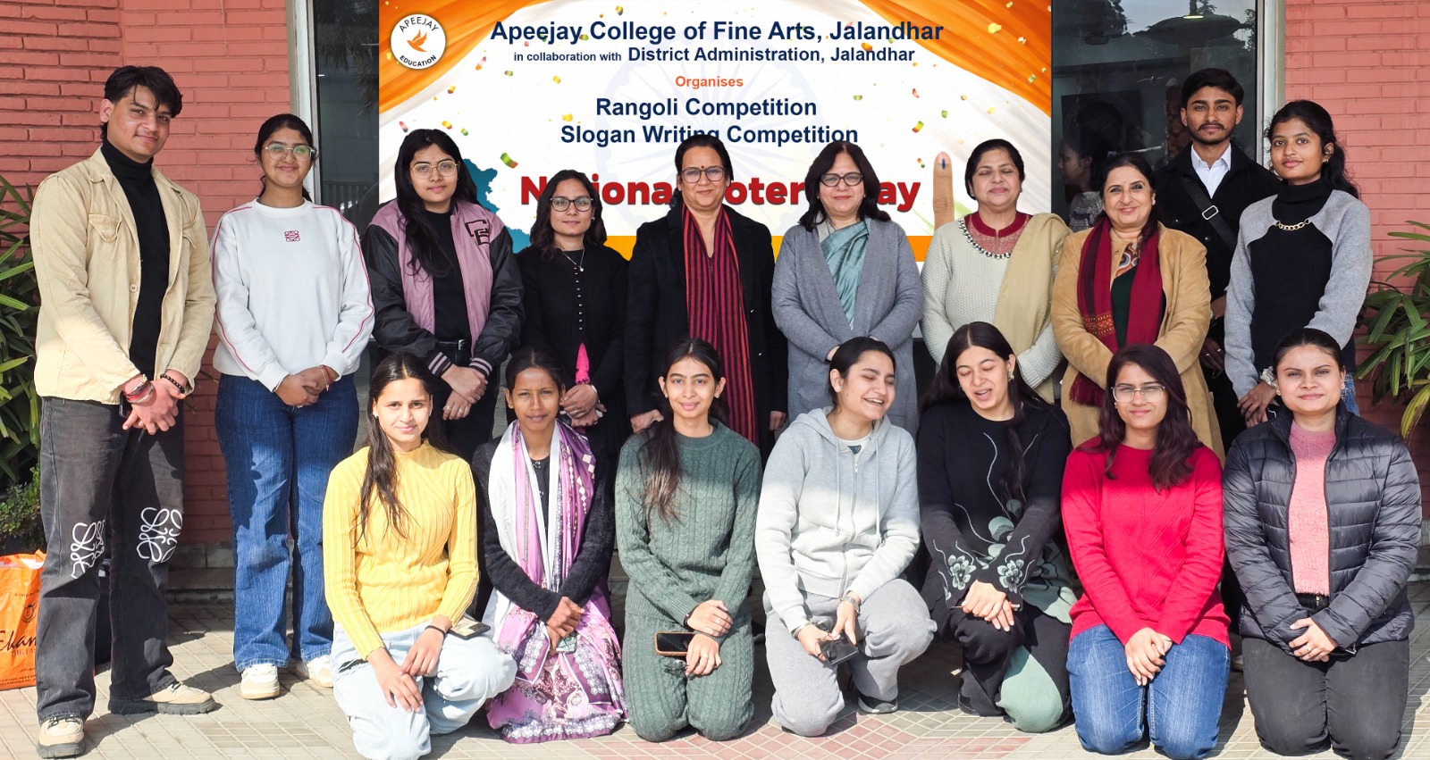जालंधर: शहर के एपीजे कॉलेज ऑफ फाइन आर्ट्स में ‘राष्ट्रीय वोटर दिवस’ के उपलक्ष्य में भारतीय चुनाव आयोग,जिला प्रशासन एवं जिला चुनाव आयोग के संयुक्त सौजन्य से रंगोली एवं स्लोगन राइटिंग प्रतियोगिताओं का आयोजन किया गया। इन प्रतियोगिताओं में जालंधर जिले के विभिन्न कॉलेज के विद्यार्थियों ने बड़े उत्साह एवं जोश से भाग लिया। राष्ट्रीय वोटर दिवस के उपलक्ष्य में करवाई जा रही इन प्रतियोगिताओं का उद्देश्य विद्यार्थियों को एक तरफ अपनी वोट के महत्व से परिचित करवाना है दूसरी तरफ उनको यह बताना है कि कई बार एक वोट भी सकारात्मक बदलाव का कारण बन सकती है।
