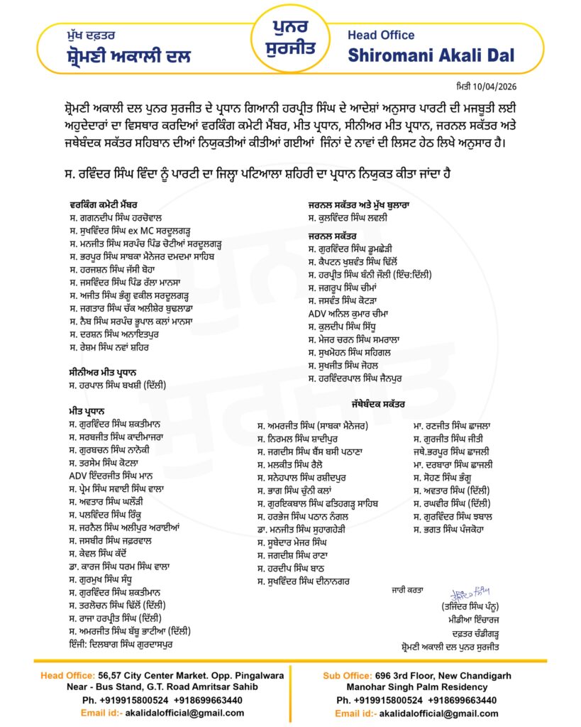 जालंधर: शिरोमणि अकाली दल पुनर सुरजीत के प्रेसिडेंट ज्ञानी हरप्रीत सिंह के आदेश के अनुसार पार्टी को मजबूत करने के लिए ऑफिस बेयरर्स को बढ़ाया गया और वर्किंग कमेटी मेंबर, वाइस प्रेसिडेंट, सीनियर वाइस प्रेसिडेंट, जनरल सेक्रेटरी और ऑर्गेनाइजिंग सेक्रेटरी साहेबान की नियुक्तियां की गईं, जिनके नामों की लिस्ट इस प्रकार है। इन आदेशों के अनुसार स. रविंदर सिंह विंदा को पार्टी के पटियाला डिस्ट्रिक्ट अर्बन डिवीजन का प्रेसिडेंट नियुक्त किया गया है।