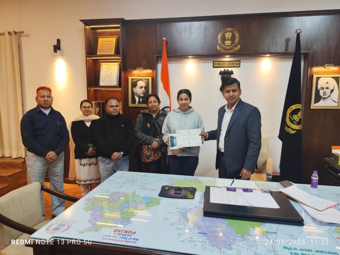 जालंधर: डिप्टी कमिश्नर-कम-जिला चुनाव अधिकारी डॉ. हिमांशु अग्रवाल ने आज पंजाब इलेक्शन क्विज-2025 को लेकर करवाई जा रही ऑनलाइन प्रतियोगिता में जिला जालंधर से प्रथम स्थान प्राप्त करने वाले छात्र को सम्मानित किया। यहां जिला प्रशासकीय परिसर में डिप्टी कमिश्नर ने ए.पी.जे. कॉलेज ऑफ फाइन आर्ट्स की छात्रा प्रगति को मुख्य चुनाव कार्यालय, पंजाब की ओर से एक मोबाइल फोन और एक प्रमाण पत्र सौंपकर इस प्राप्ति के लिए मुबारकबाद दी। उन्होंने छात्रों का मनोबल बढ़ाया और भविष्य में उसकी सफलता की कामना की।