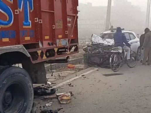 स्कूटियों को टक्कर मरने के बाद अनयंत्रित कार रोड साइड खड़े ट्रक में जा घुसी