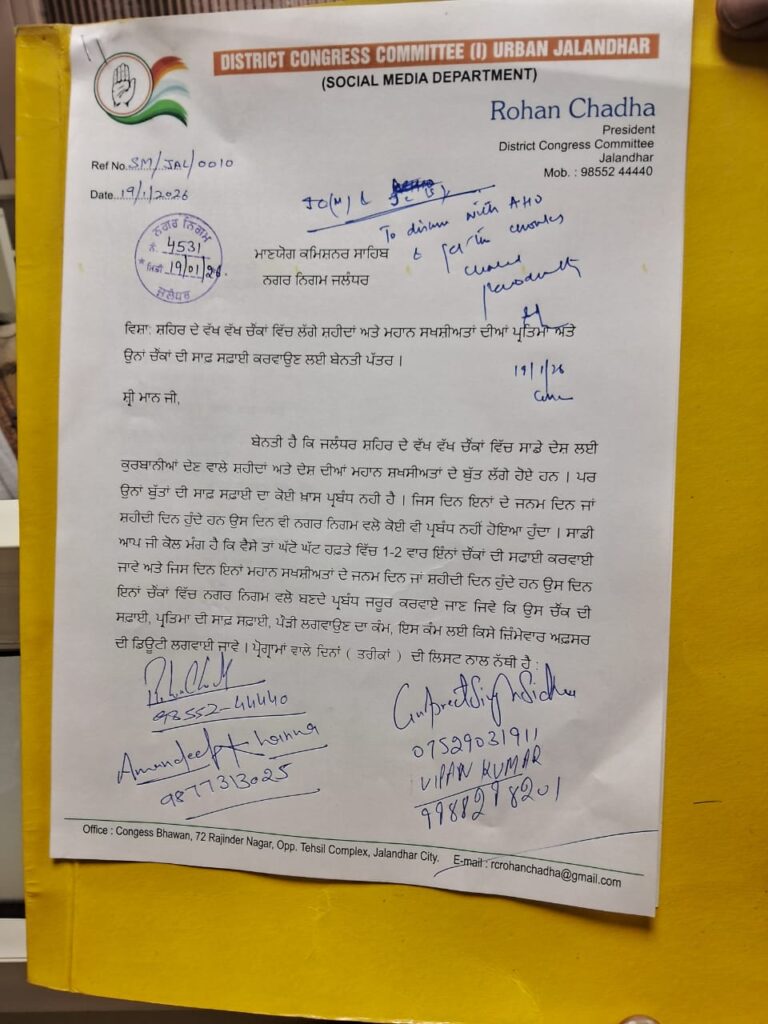 जालंधर: जिला कांग्रेस कमेटी शहरी की लीडरशिप ने देश के शहीदों और महान हस्तियों के शहर के चौकों पर लगे बुतों की साफ़ सफाई को लेकर आज नगर निगम के कमिश्नर संदीप ऋषि को एक मांग पत्र सौंपा। जिसमें उन्होंने निगम कमिश्नर से निवेदन किया कि हमारे देश के लिए कुर्बानी देने वाले महान शहीदों की जालंधर शहर के अलग-अलग चौकों पर लगी मूर्तियों की सफ़ाई का खास प्रबंध किया जाए।