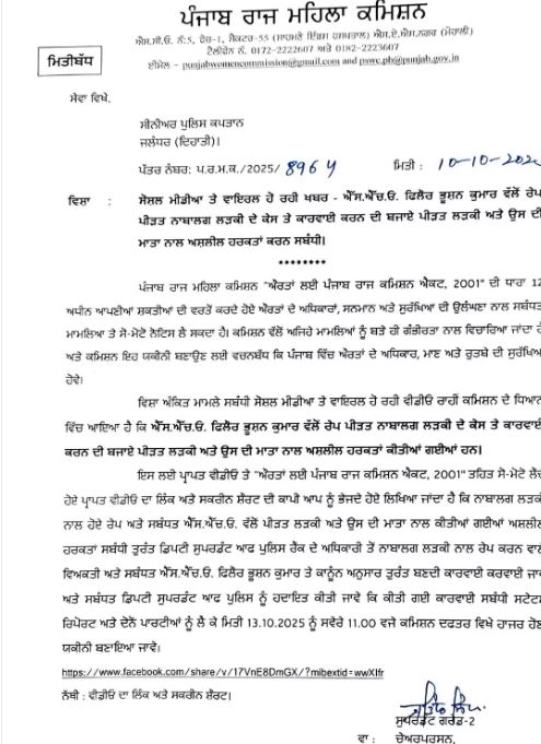 जालंधर: फिल्लौर में प्रवासी नाबालिग लड़की से रेप मामले में SHO भूषण द्वारा पीड़िता की माँ को अकेले में बुलाने के चलते जालंधर के एसएसपी को एक नोटिस जारी हुआ है। ये नोटिस SHO भूषण के खिलाफ पंजाब महिला आयोग द्वारा जालंधर के एसएसपी को भेजा गया है। जारी नोटिस में आयोग ने आरोप लगाया है कि नाबालिग लड़की से रेप मामले में SHO भूषण कुमार ने कार्रवाई करने के बजाय पीड़िता और उसकी मां के साथ गलत हरकतें की हैं।
