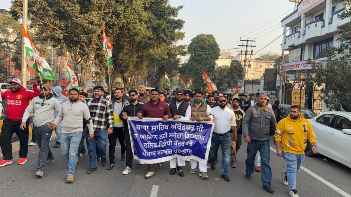 जालंधर : अमृतसर में संविधान निर्माता बाबा साहब अंबेडकर जी की प्रतिमा के क्षतिग्रस्त होने पर पुरे पंजाब में रोष है, इसी कड़ी में युवा कांग्रेस ने रैली निकाली। इसी के साथ पंजाब सरकार और केंद्र सरकार के खिलाफ मुर्दाबाद के नारे भी लगाए।